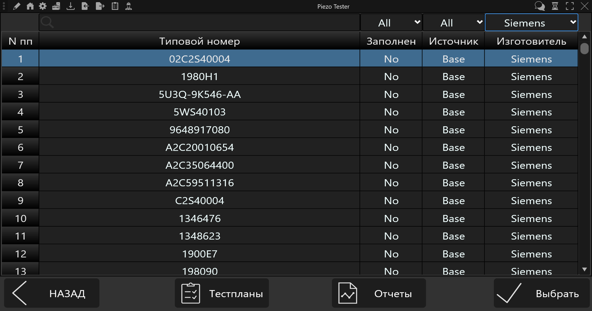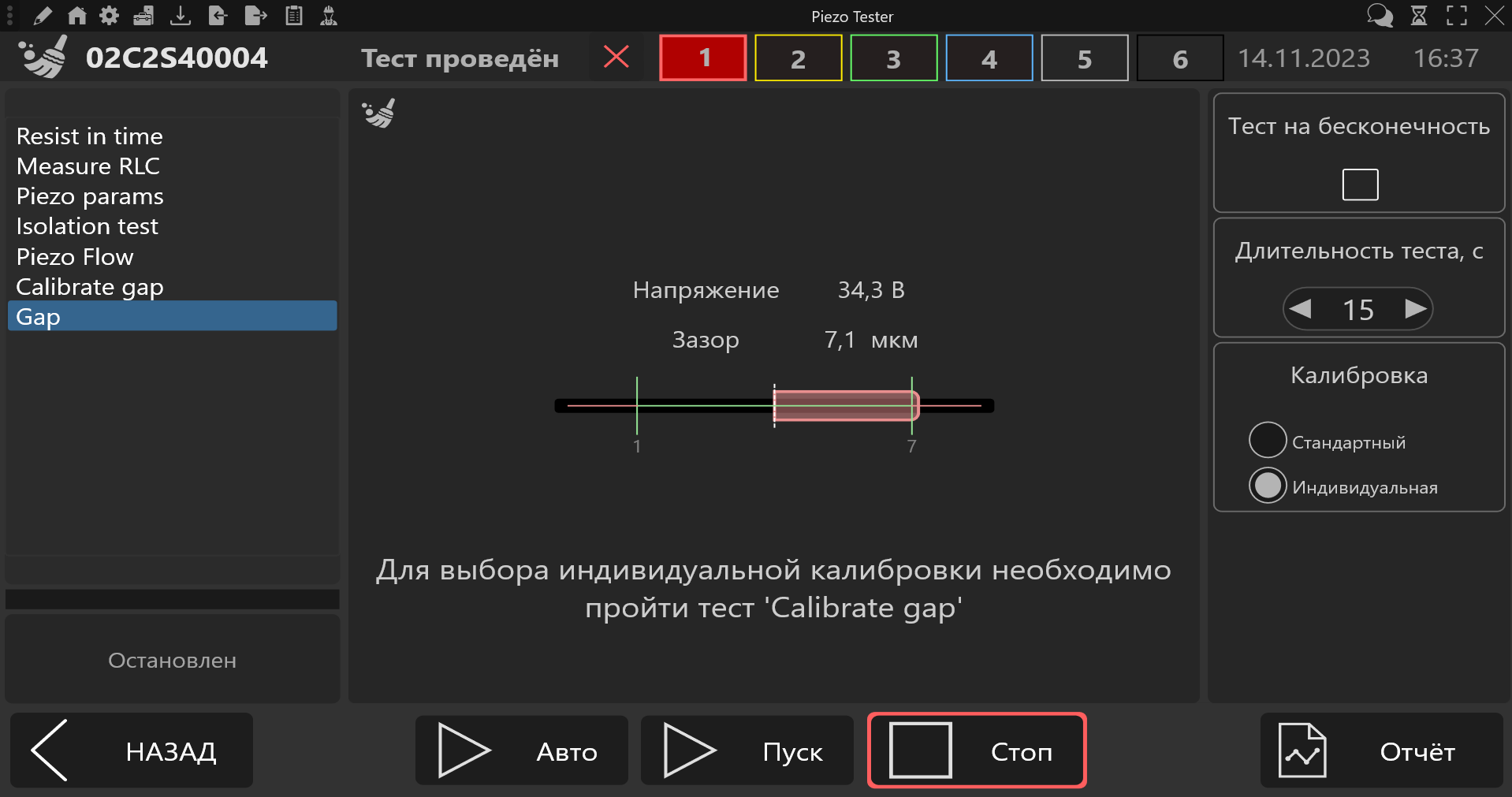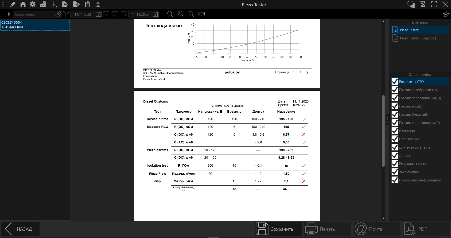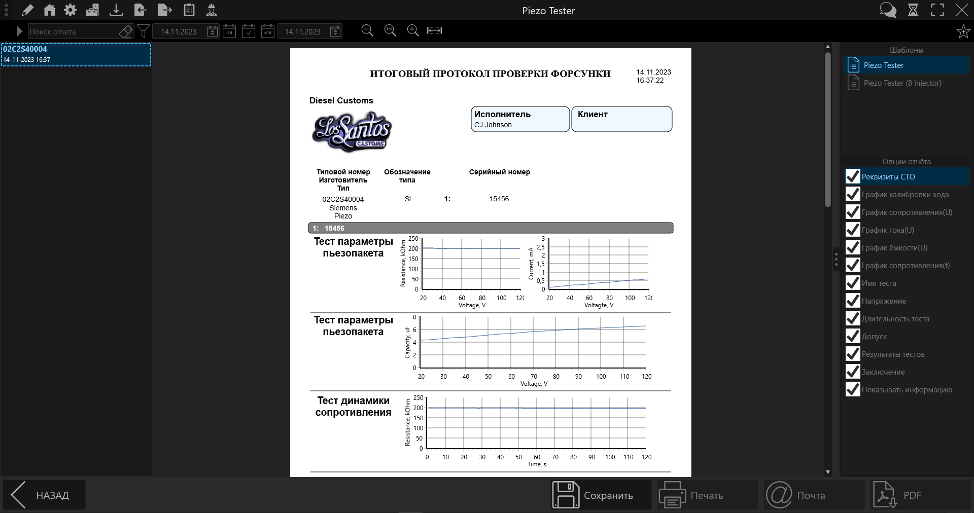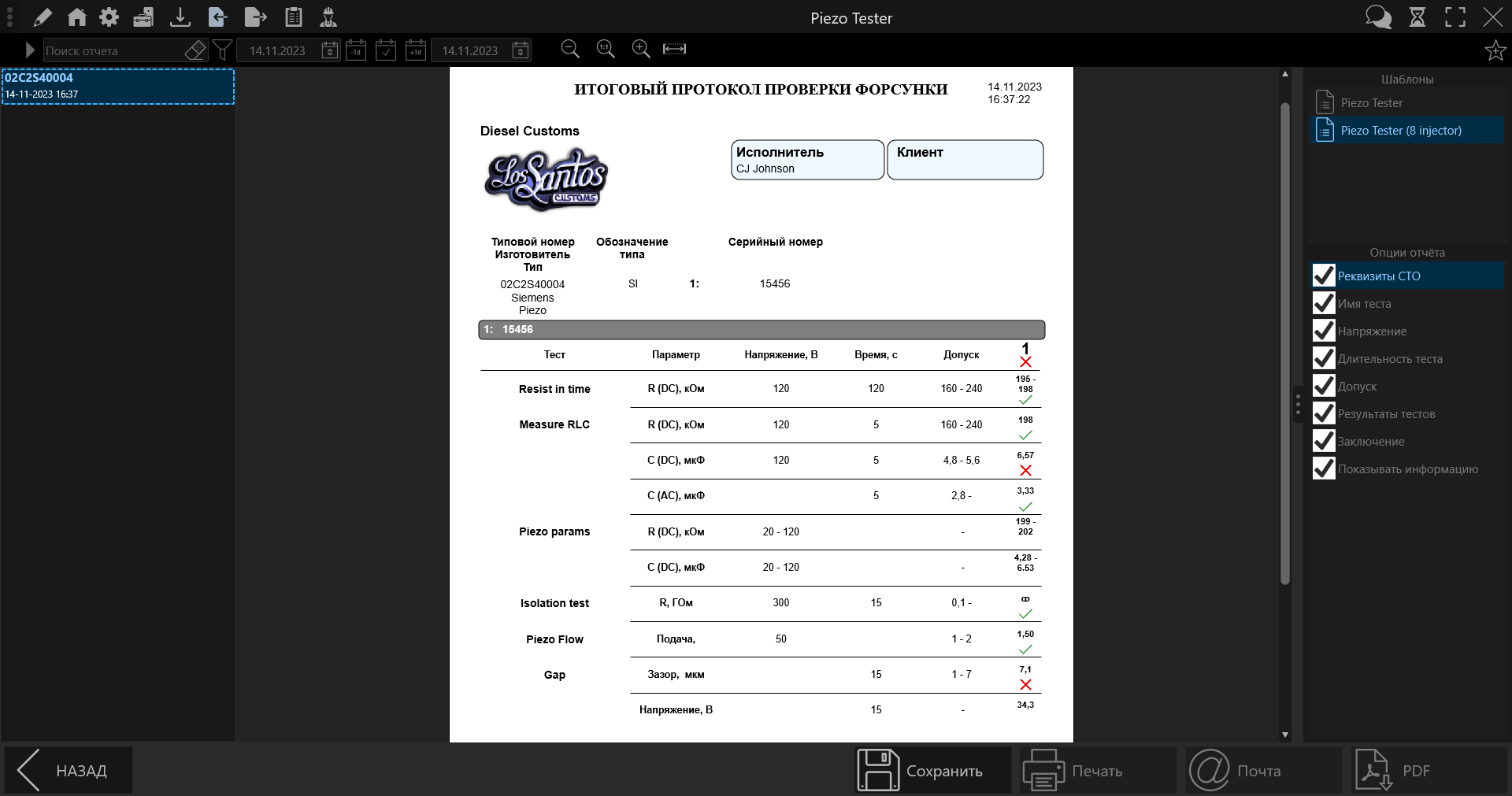 - ведение базы результатов проверок форсунок с возможностью построения отчетов различных форм;
