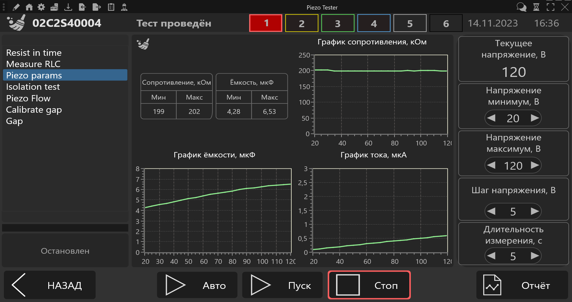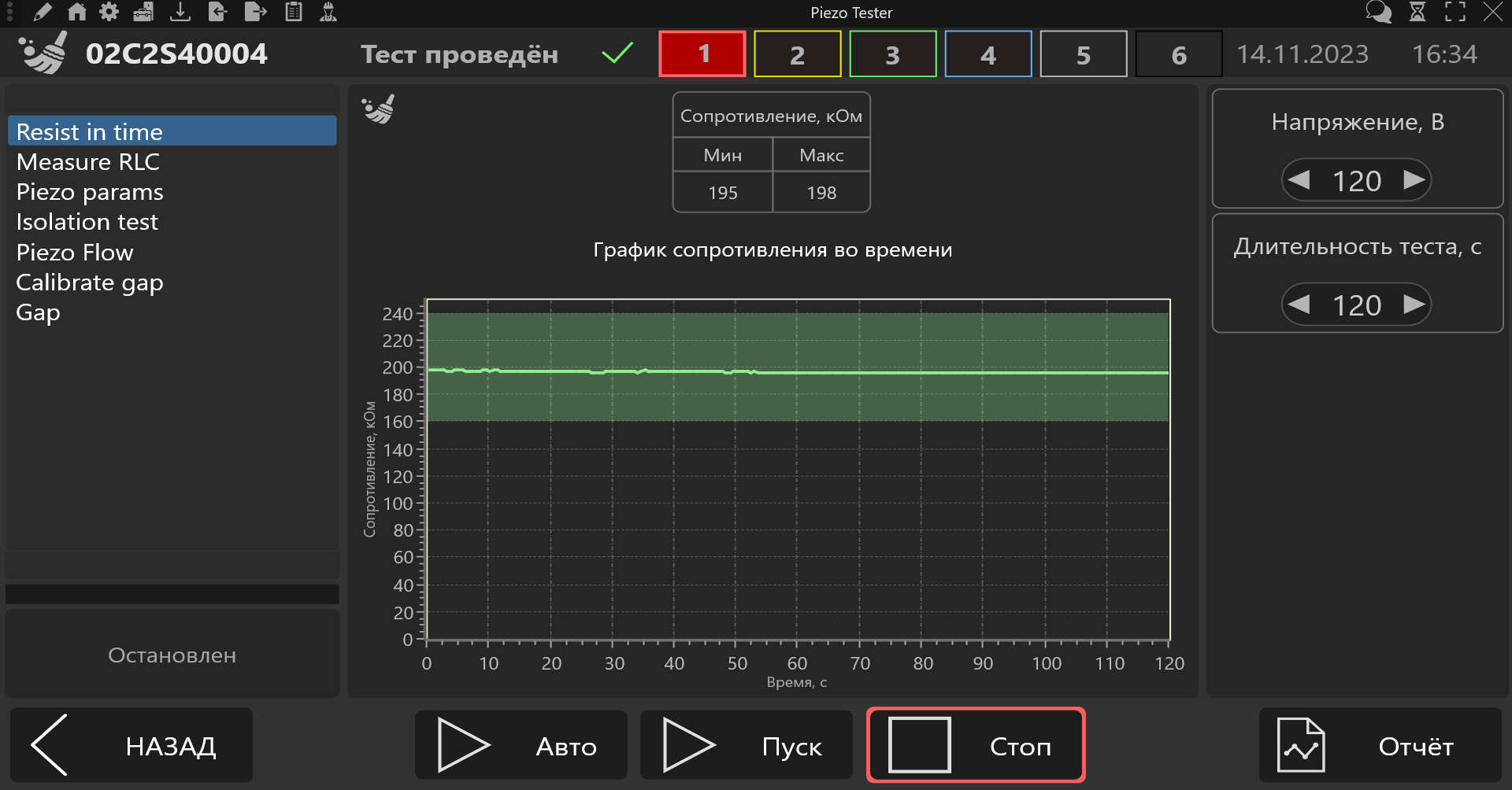 - построение графика изменения сопротивления пьезопакета во времени;